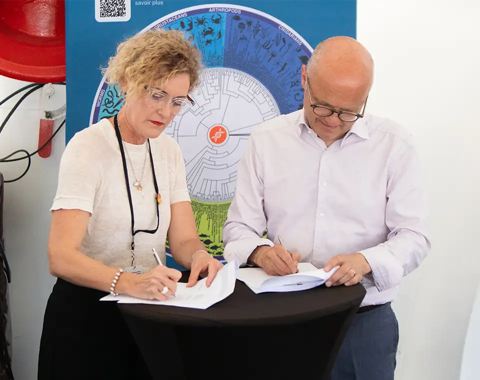 Caption: Holly Buschman, Executive Director Natural Ecosystems at Minderoo Foundation and Vidar Helgesen, Executive Secretary of the Intergovernmental Oceanographic Commission (IOC) of UNESCO, and Assistant Director-General of UNESCO Conference sign the eDNA Expeditions agreement at the UN Ocean Conference in Nice.