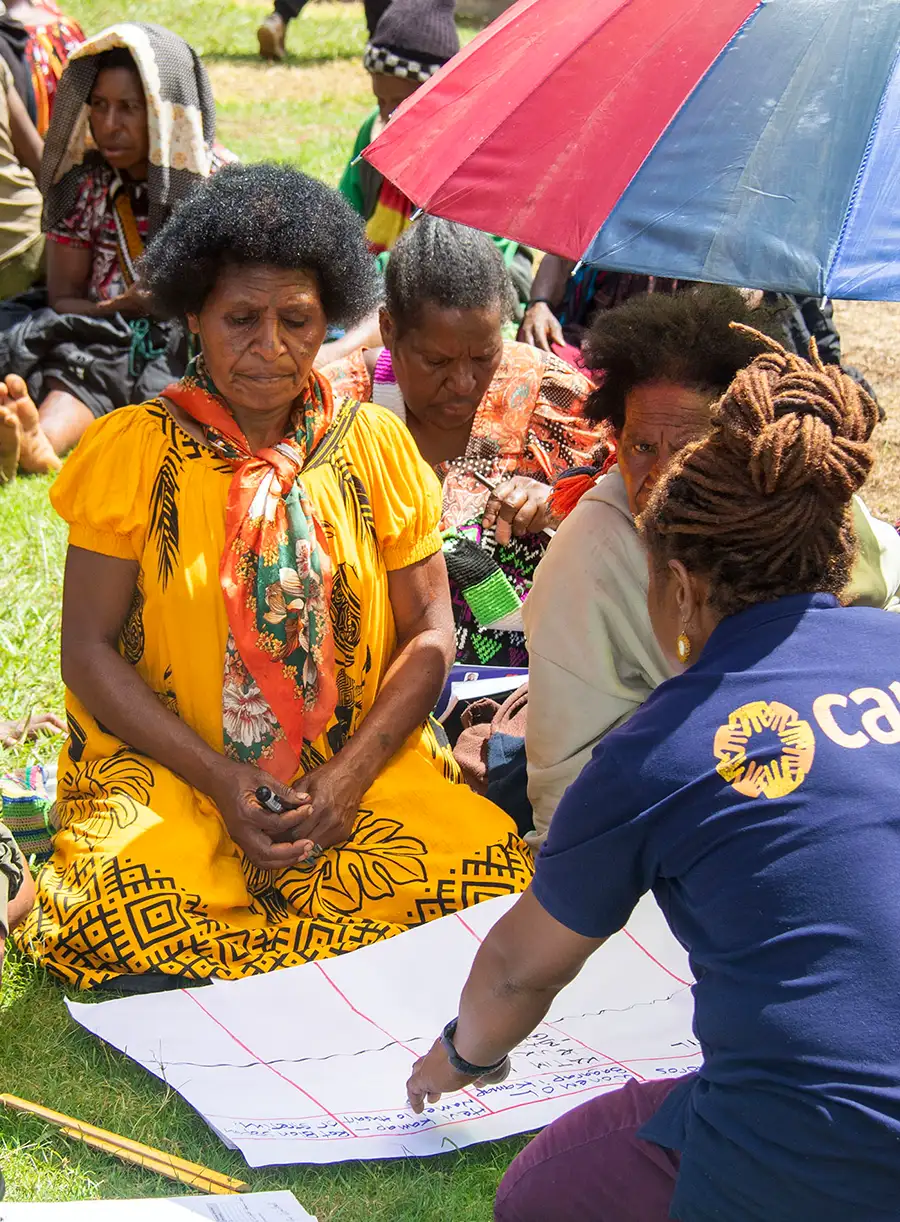 Caption: CARE staff working with local women in Enga. Credit: CARE Australia.